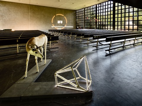 Een installatie in een kerk in Zeist met werk van Claas Westerhof, Paul Segers, Merijn Haenen en Herman Lamers